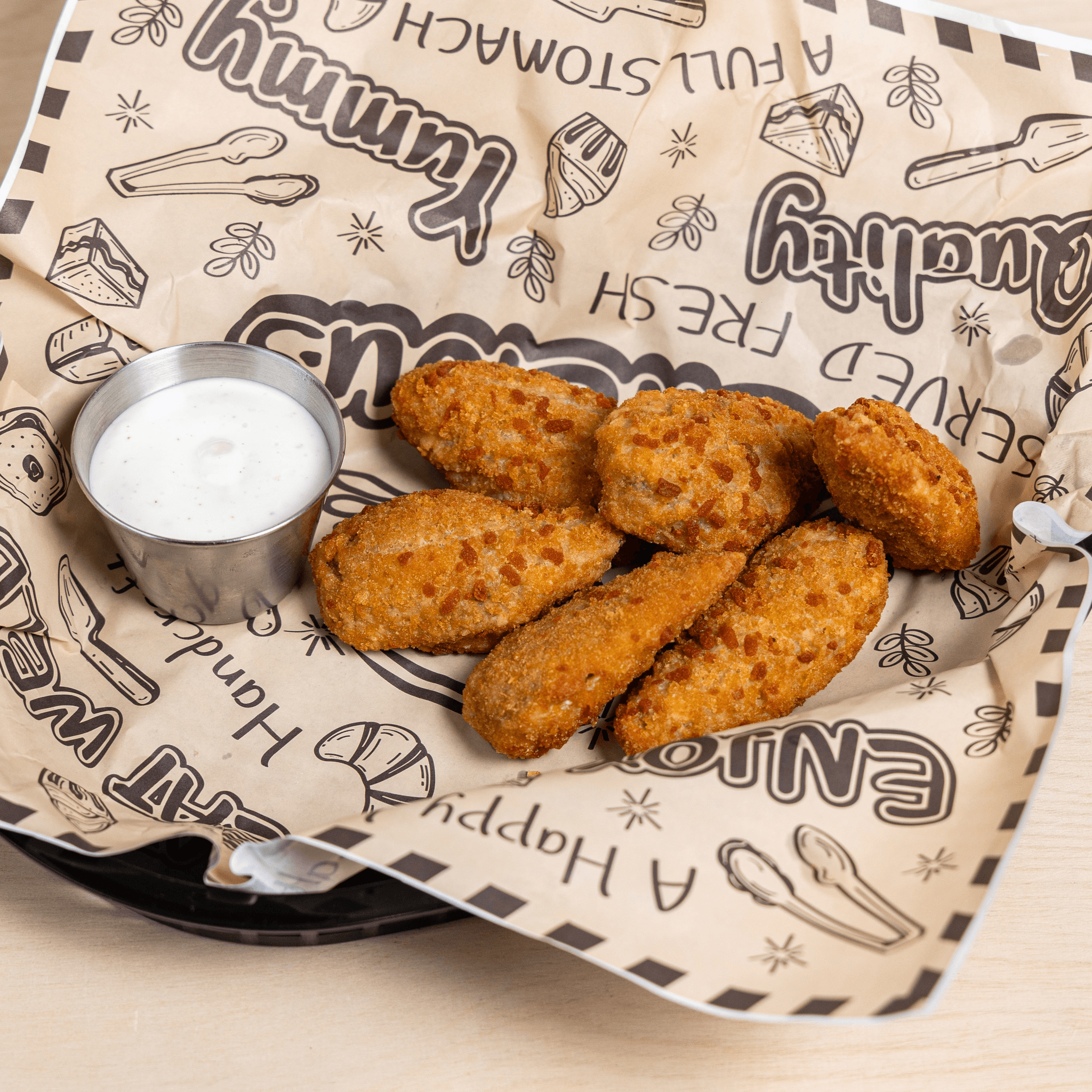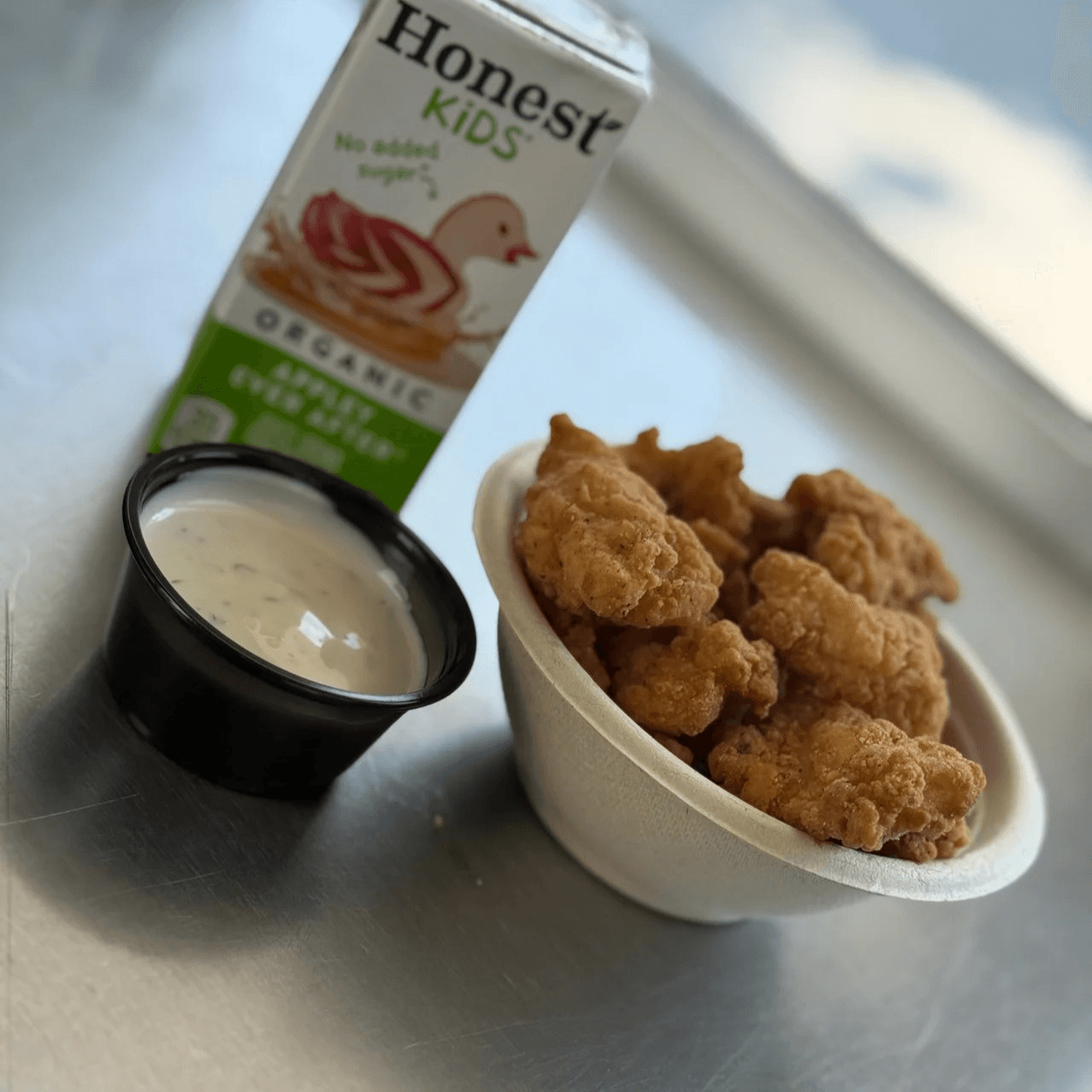 6 crispy chicken nuggets served with seasoned tater tots or French fries.