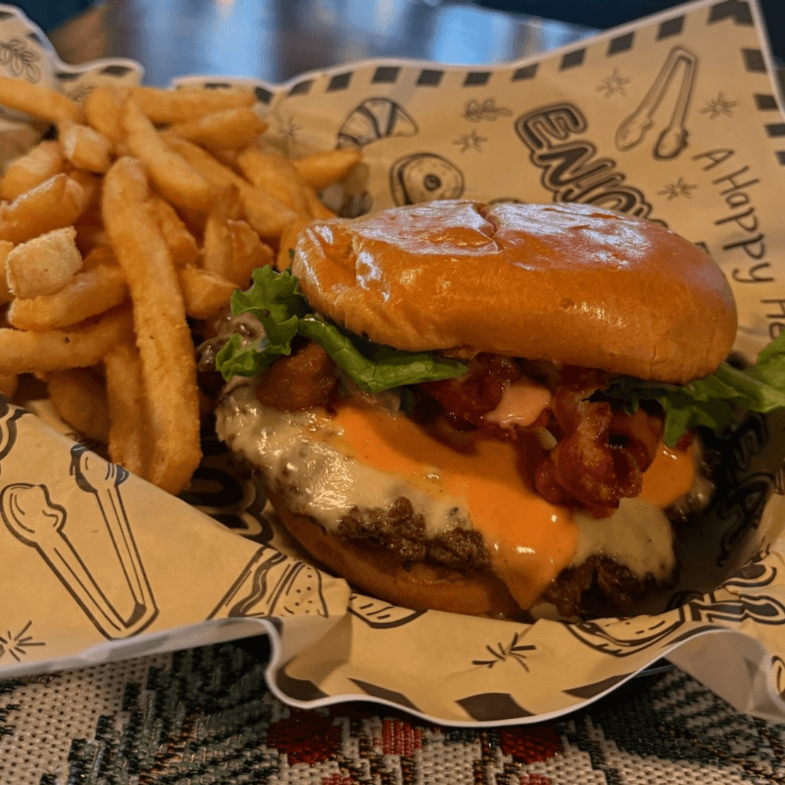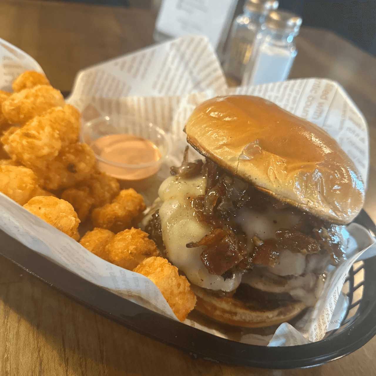 Single beef pattie topped with American cheese, pickles, crispy chicken, BBQ sauce and our signature house sauce on top of crispy seasoned tater tots