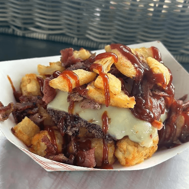 Tater tots tossed with house seasoning topped with a single beef patty, Pepper Jack cheese, bacon, onion ring pieces and tangy BBQ sauce