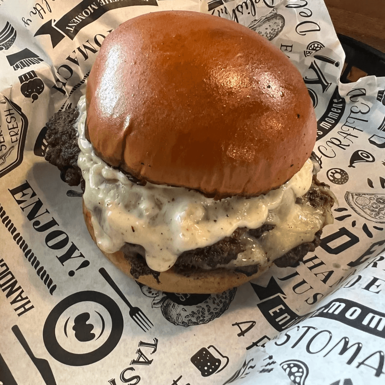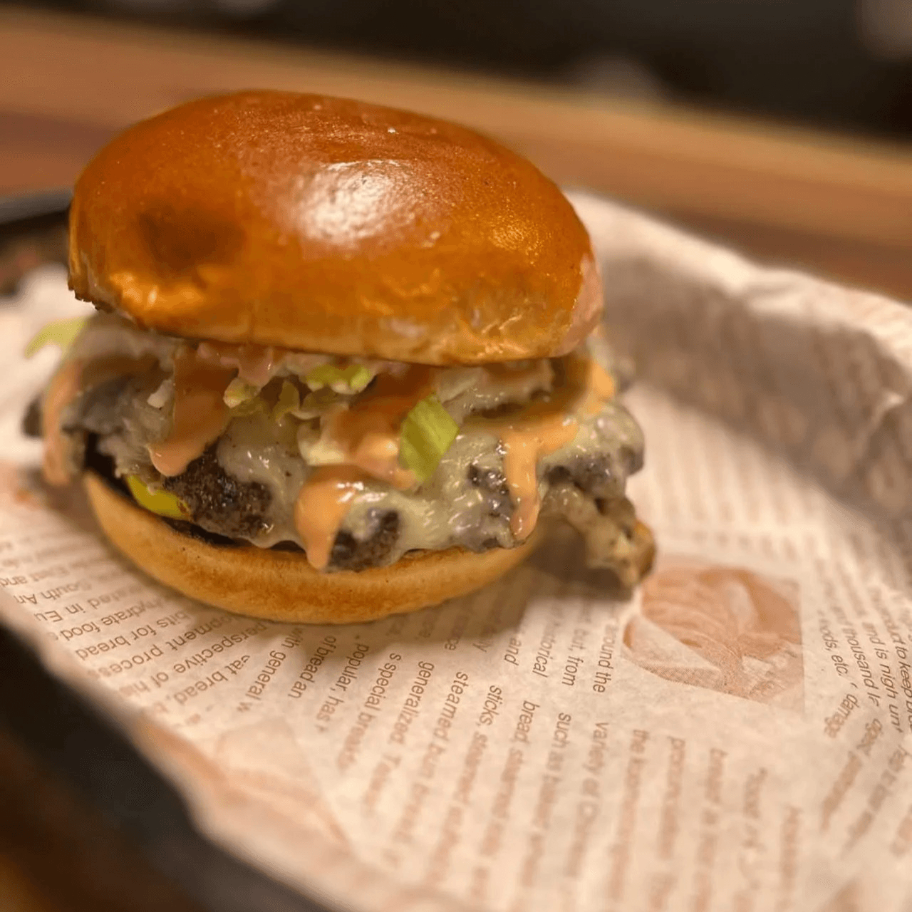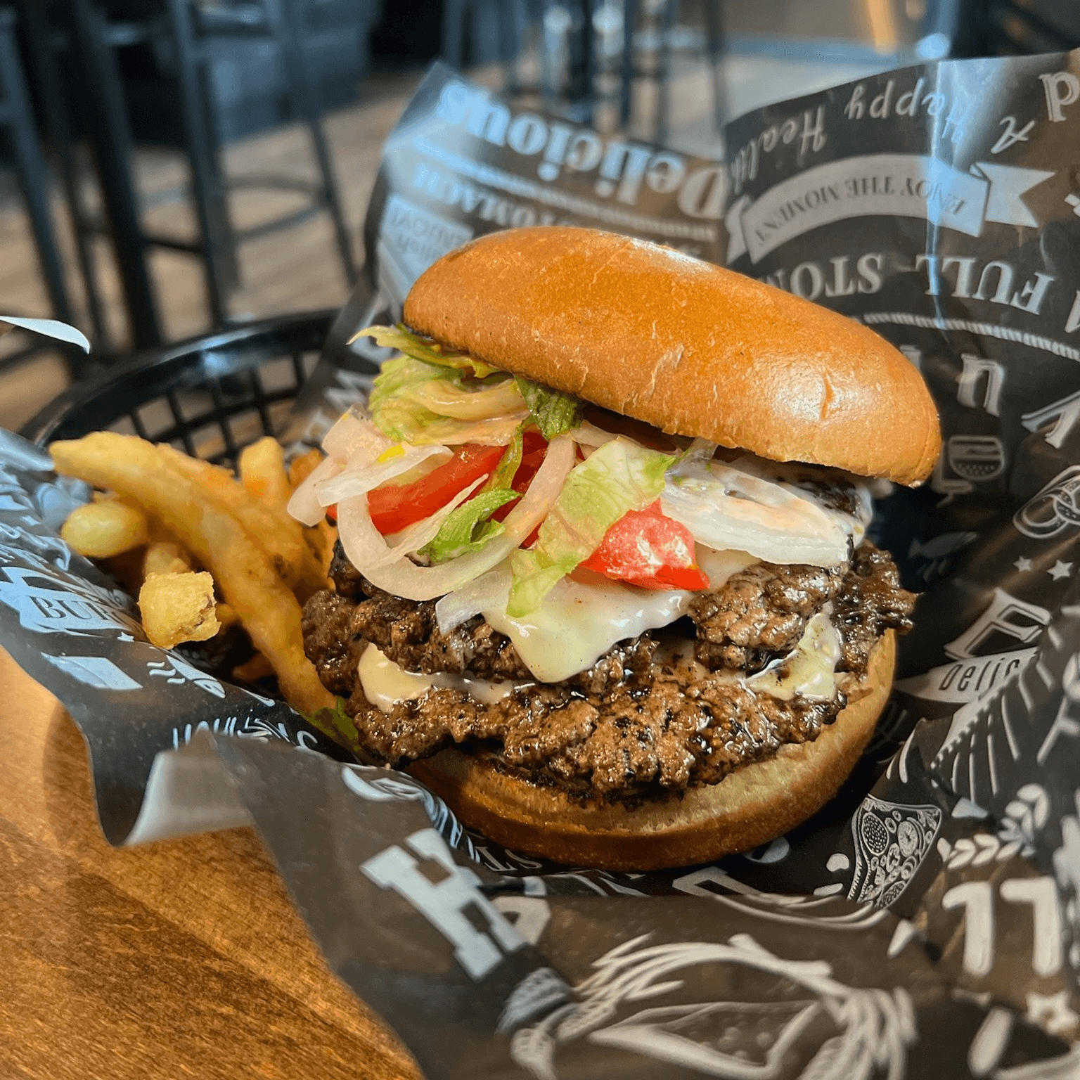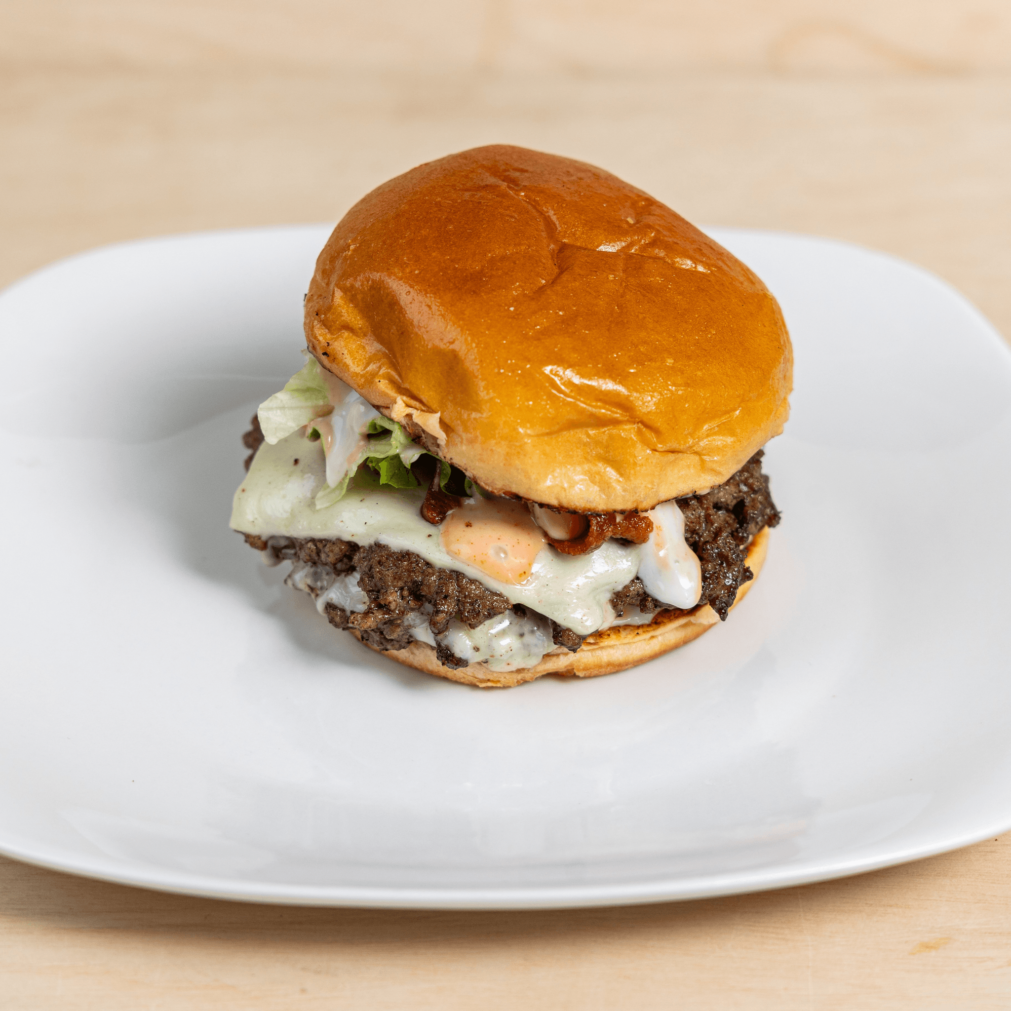 Two beef patties topped with American cheese, applewood smoked bacon, lettuce, pickles, creamy blue cheese, and our signature house sauce on a toasted brioche bun