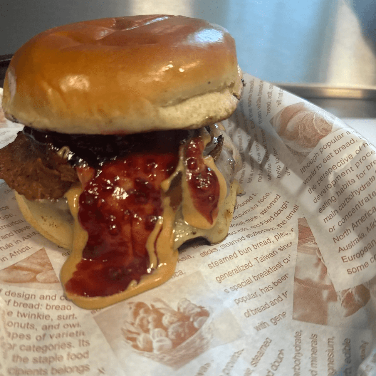 Two beef patties topped with VT Cheddar cheese, applewood smoked bacon, creamy peanut butter, and raspberry jam on a toasted brioche bun