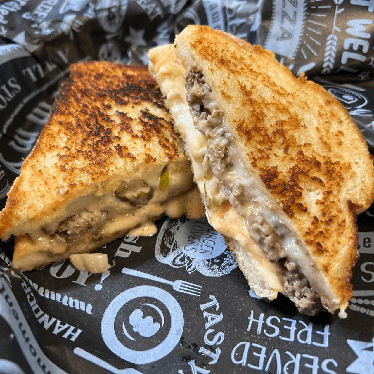 Single beef patty melted with American cheese, pickles, and our house signature sauce on buttery toasted sourdough bread
