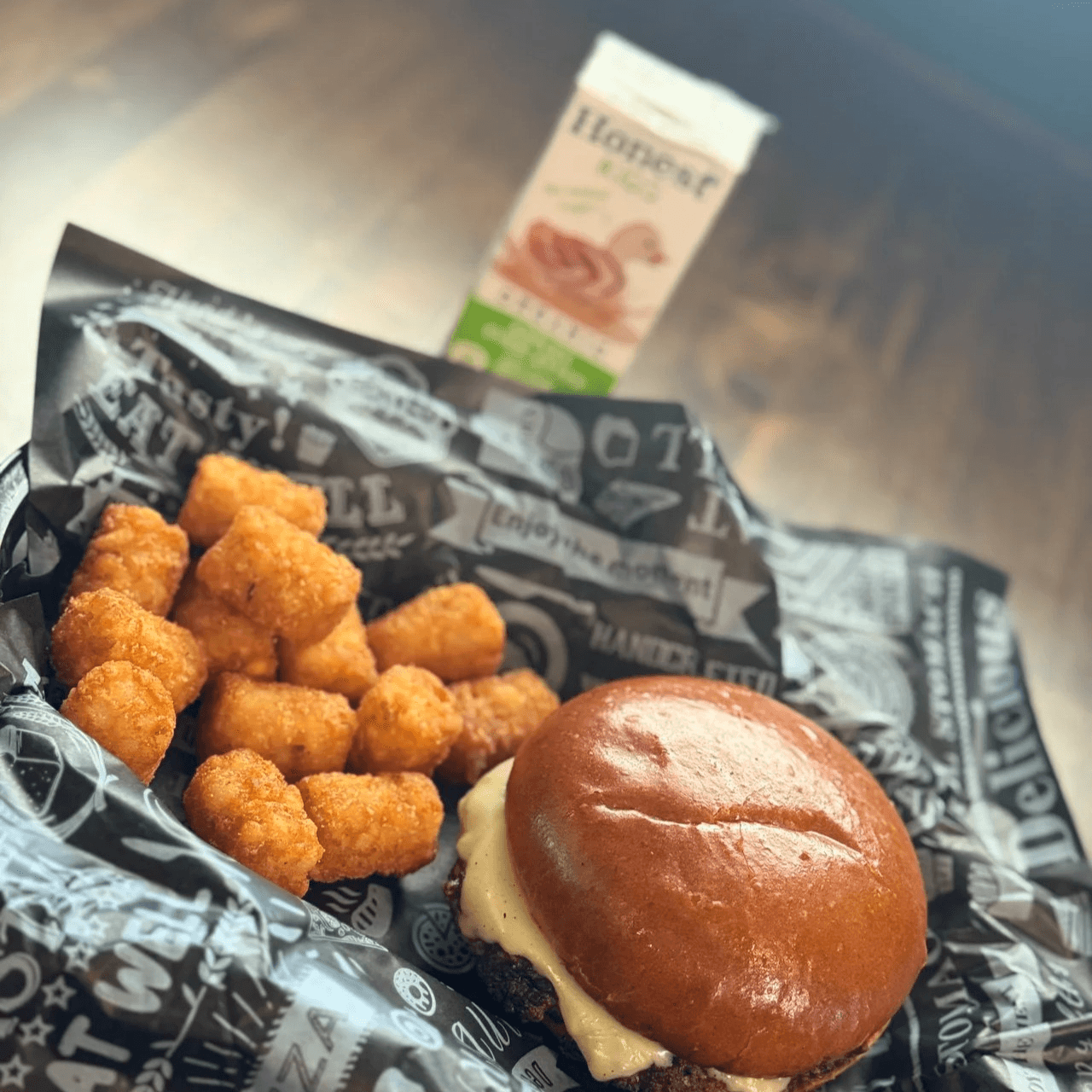 Single beef patty topped with American cheese on a toasted brioche bun served with seasoned tater tots or French fries.