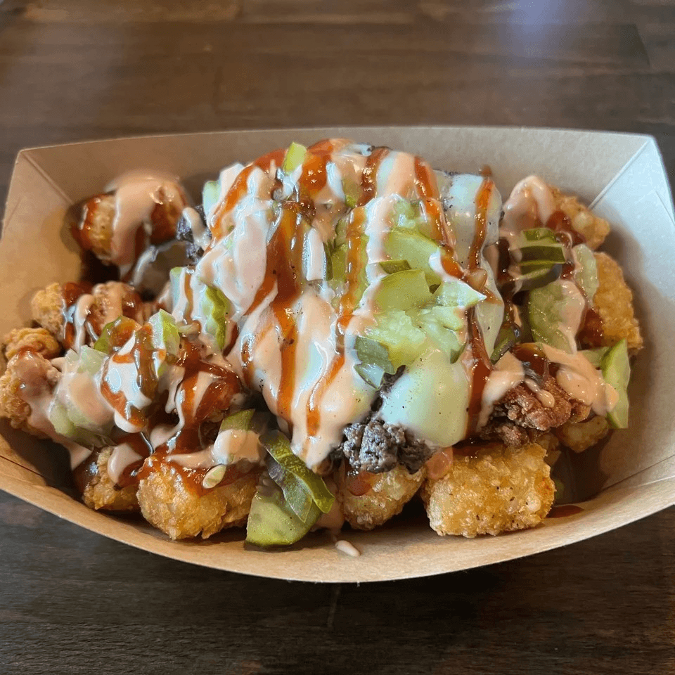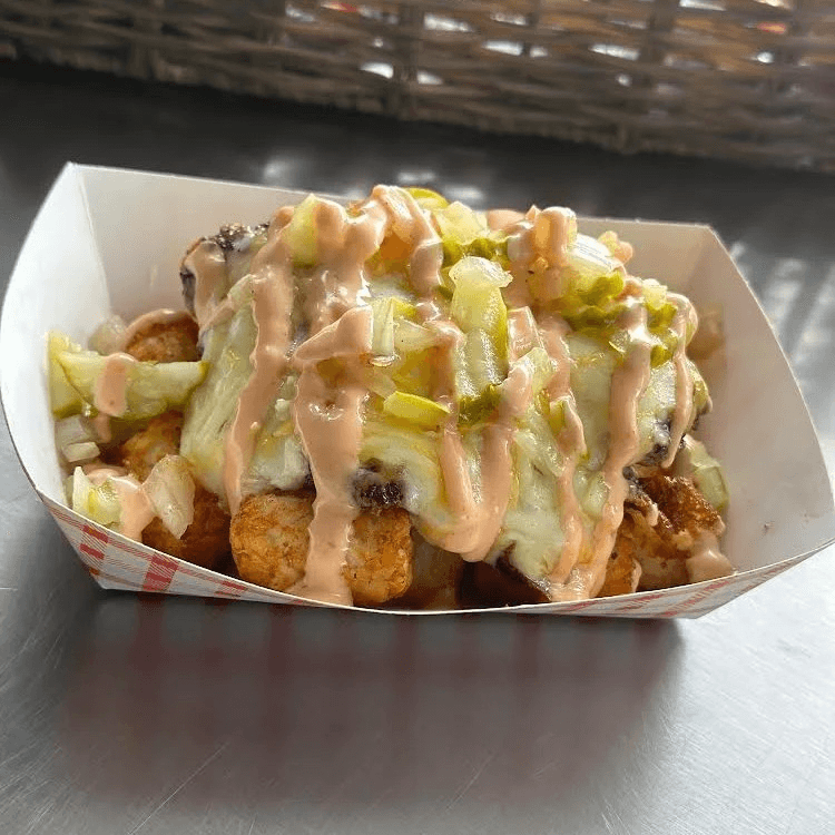 Tater tots tossed with house seasoning topped with a single beef patty, American cheese, lettuce, pickles, sautéed onion and our signature house sauce