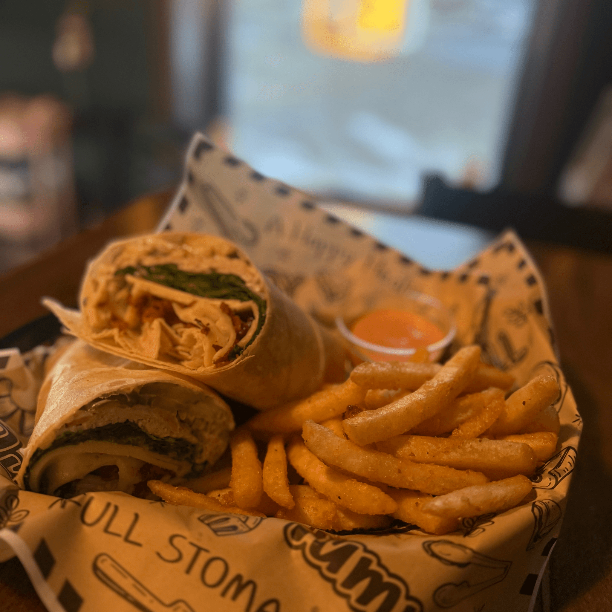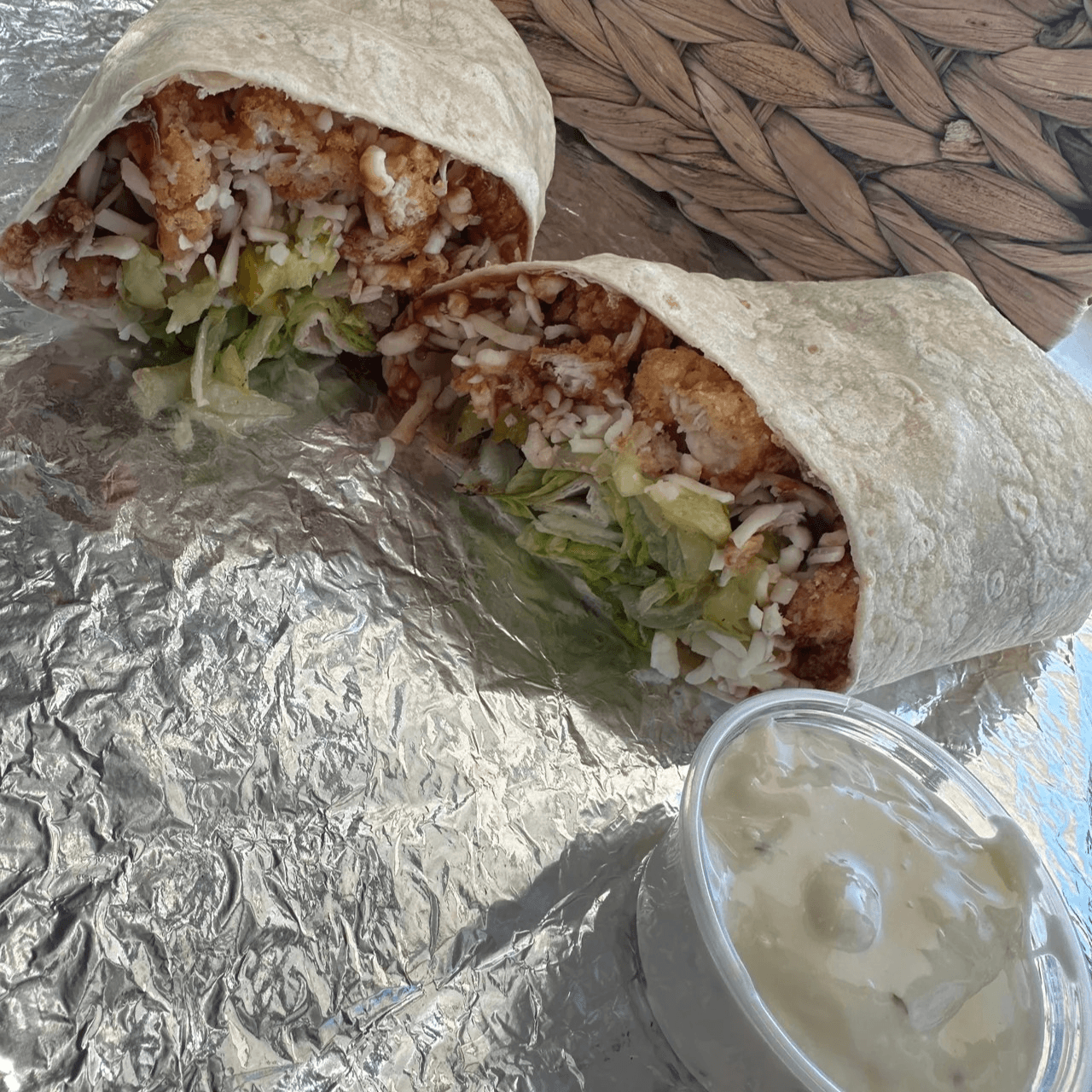 Crispy chicken wrapped in a 12" flour tortilla with lettuce, pickles, mixed cheese blend, and house-made buffalo sauce