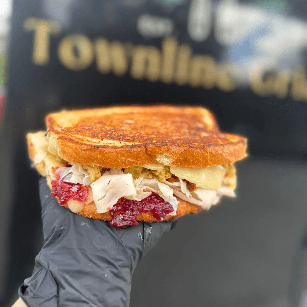 Oven roasted turkey, stuffing, and cranberry sauce with melted VT Cheddar cheese on golden toasted sourdough bread