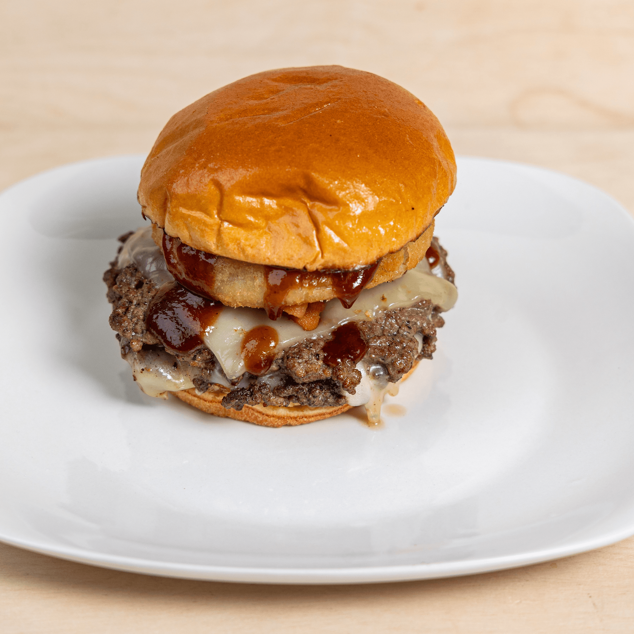 Two beef patties topped with Pepper Jack cheese, applewood bacon, onion ring pieces and tangy BBQ sauce on a toasted brioche bun