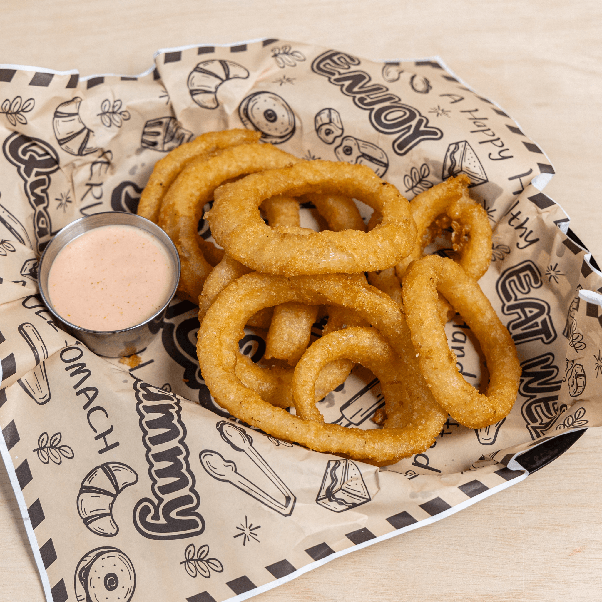 Crispy golden beer batter onion rings.