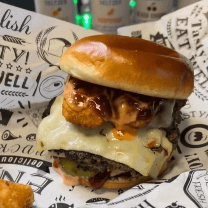 Two beef patties topped with Pepper Jack cheese, pickles, jalapeño poppers, BBQ and our signature house sauce on a toasted brioche bun